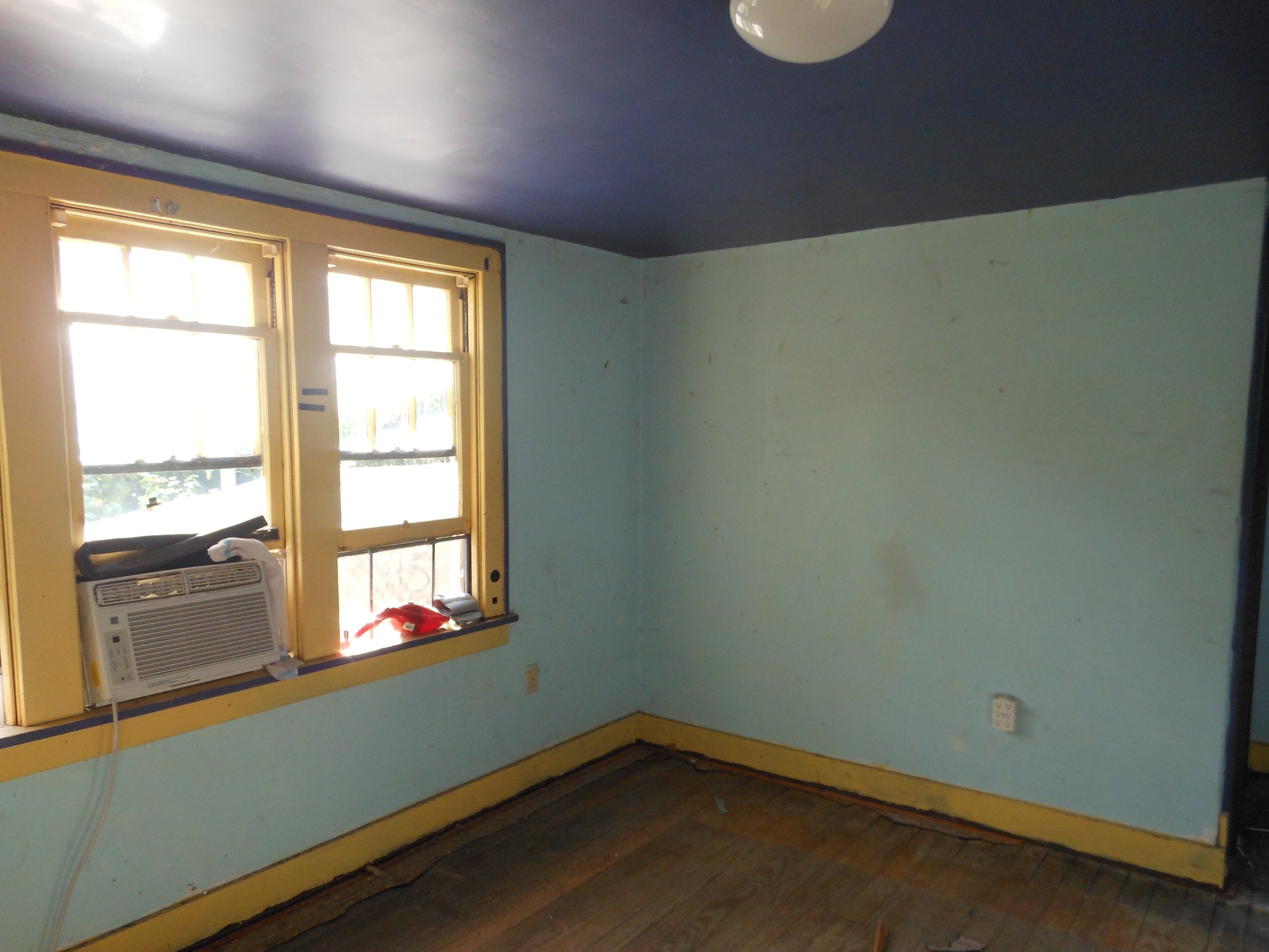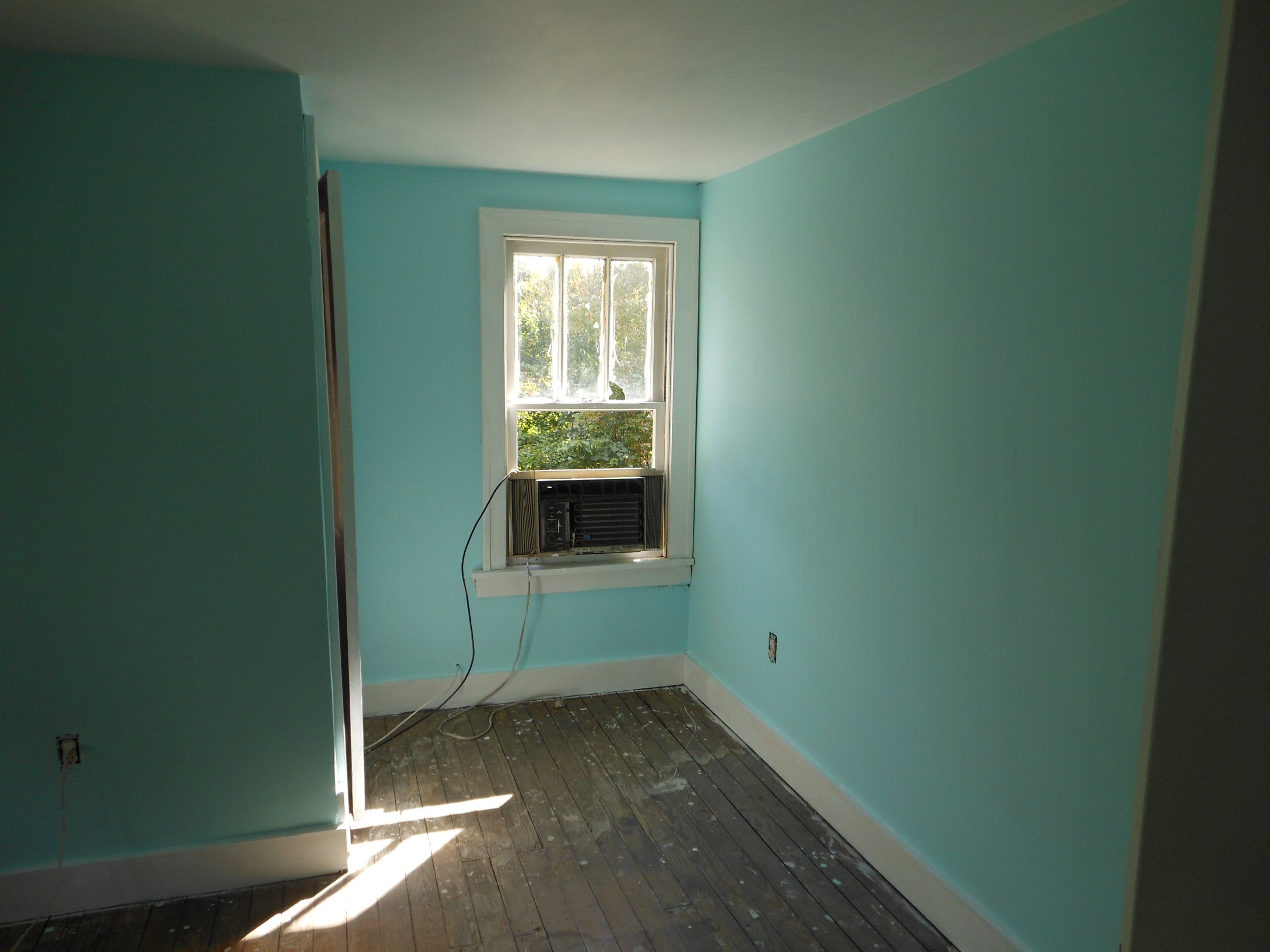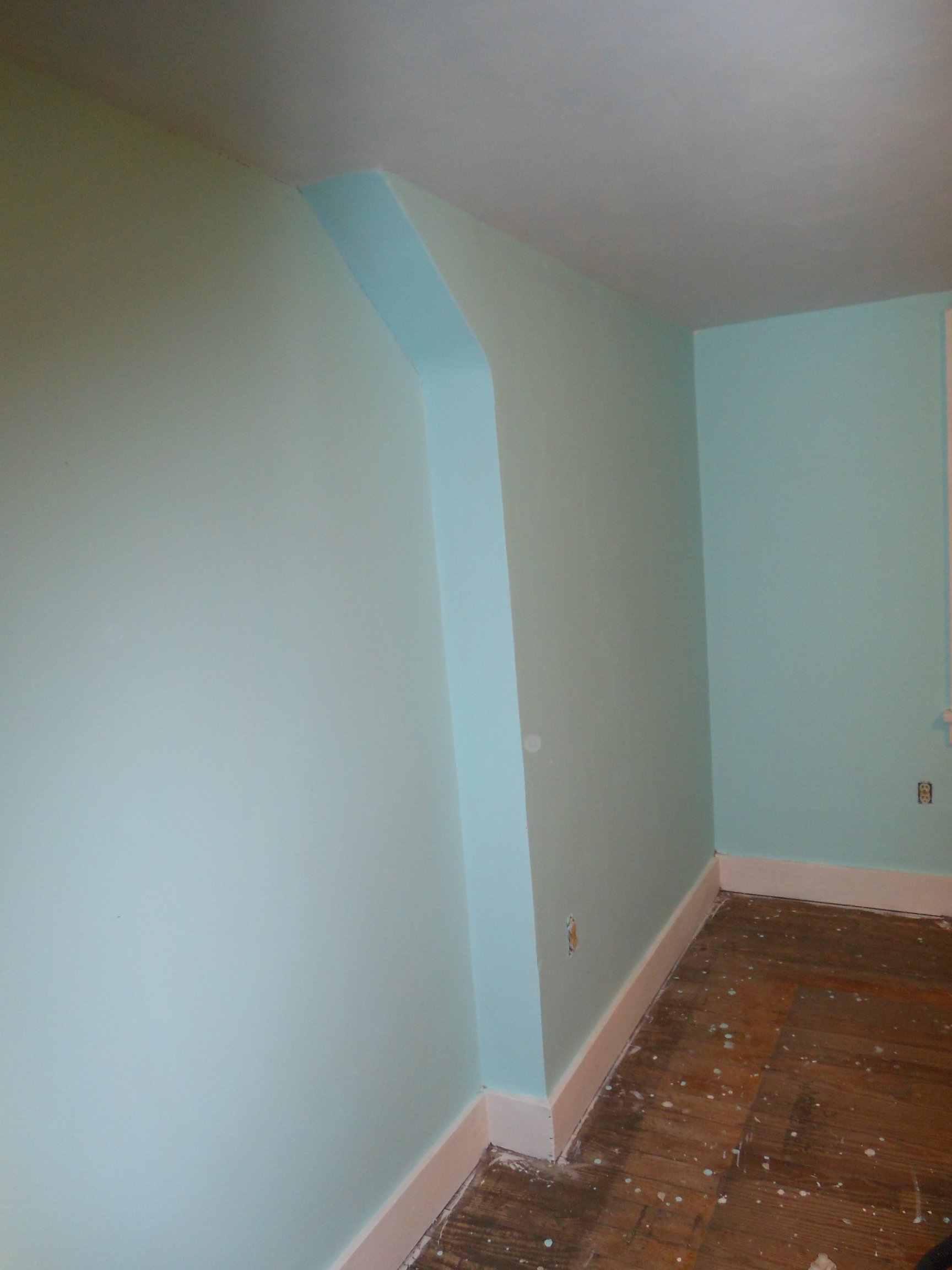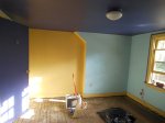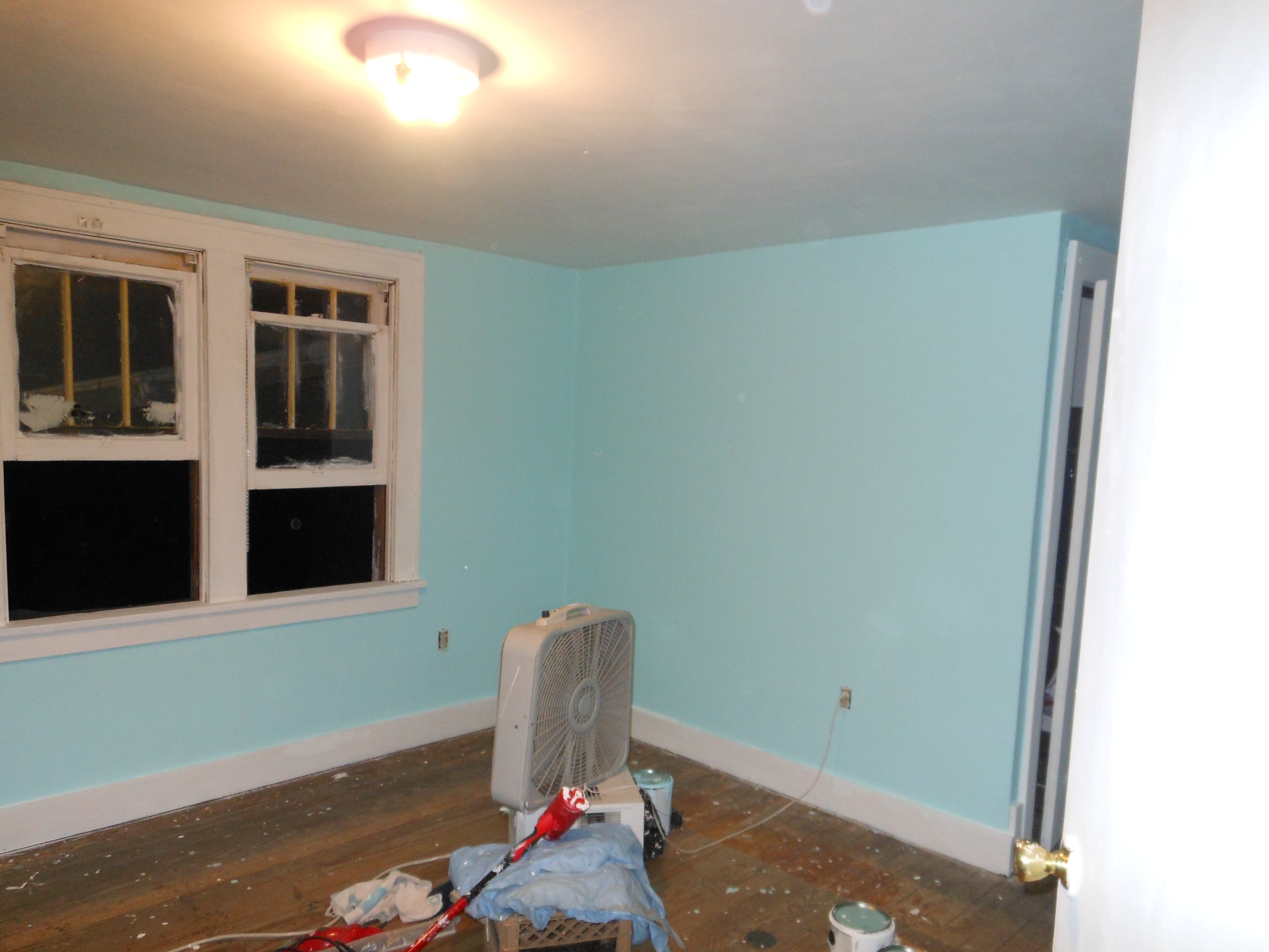 The bedroom started as a bad rendition of a VanGogh painting. Dark Blue on the ceiling and doors, dark yellow on some of the walls and all of the trim, and another shade of lighter blue on the non-yellow walls.