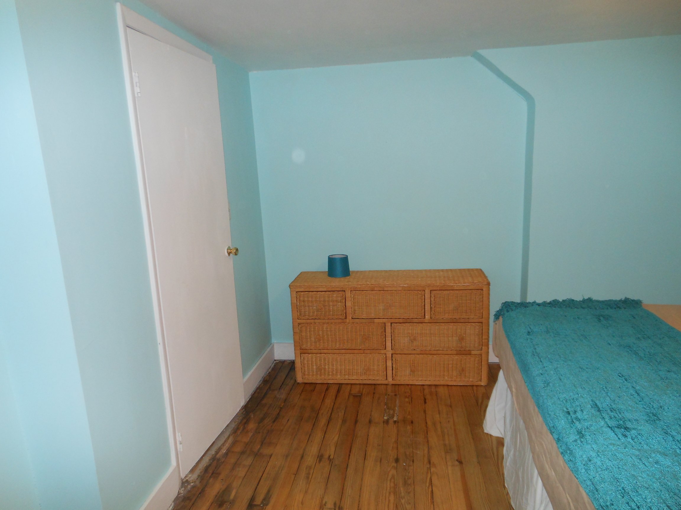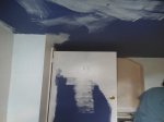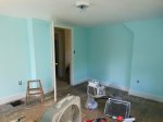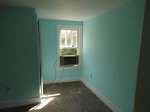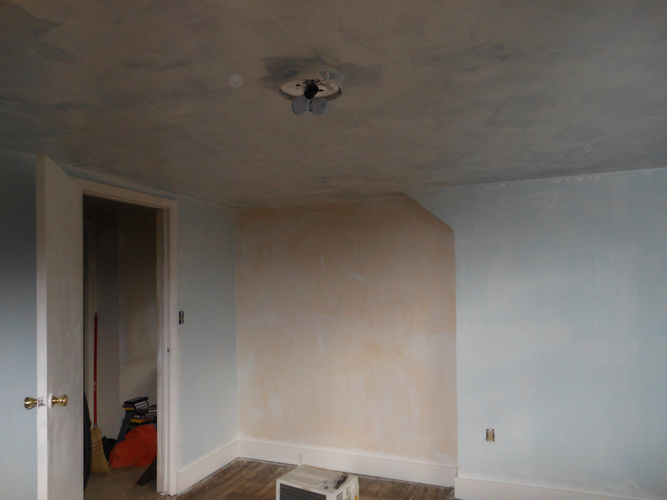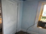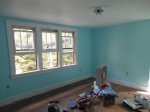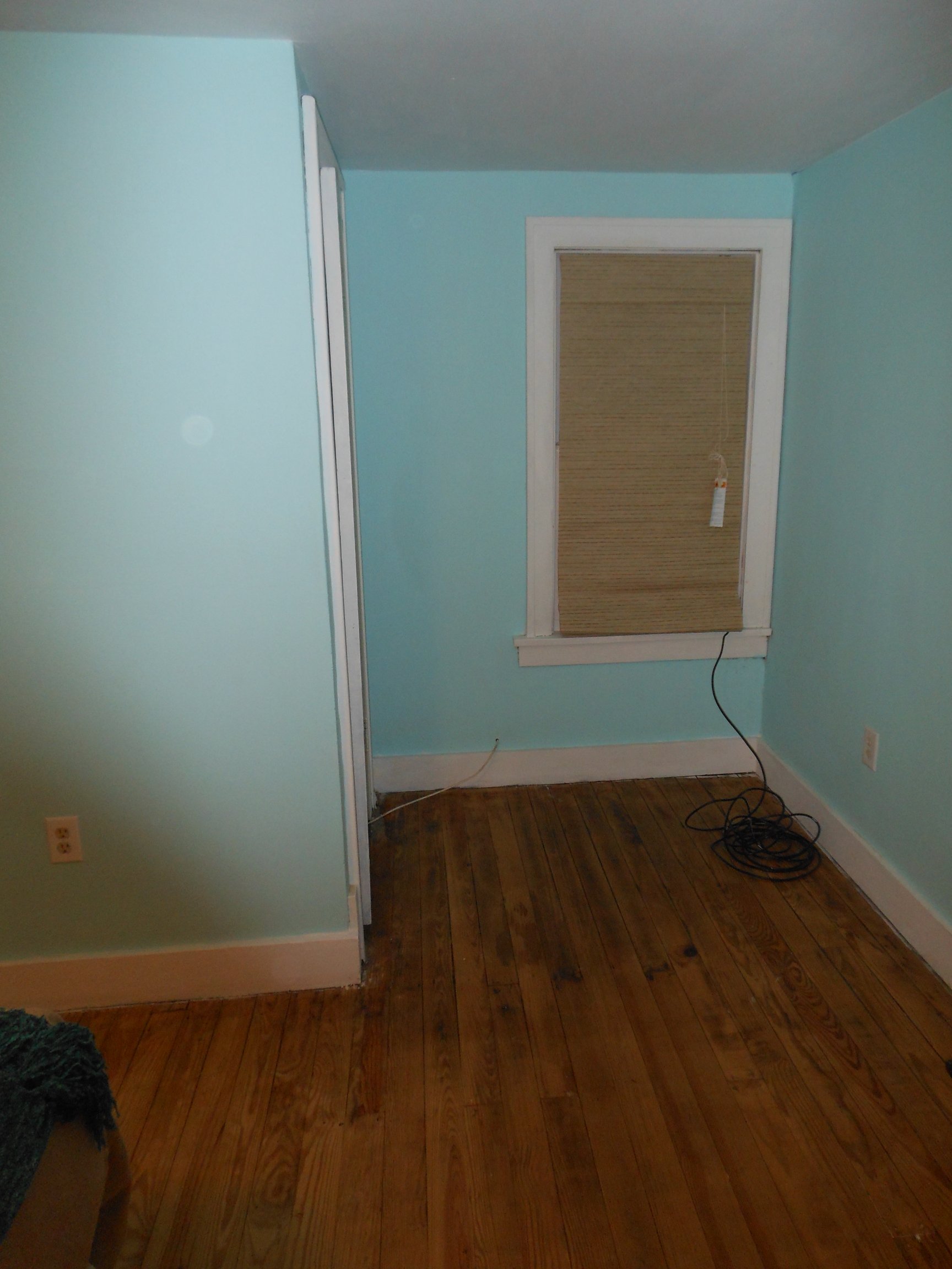 The bedroom started as a bad rendition of a VanGogh painting. Dark Blue on the ceiling and doors, dark yellow on some of the walls and all of the trim, and another shade of lighter blue on the non-yellow walls.