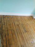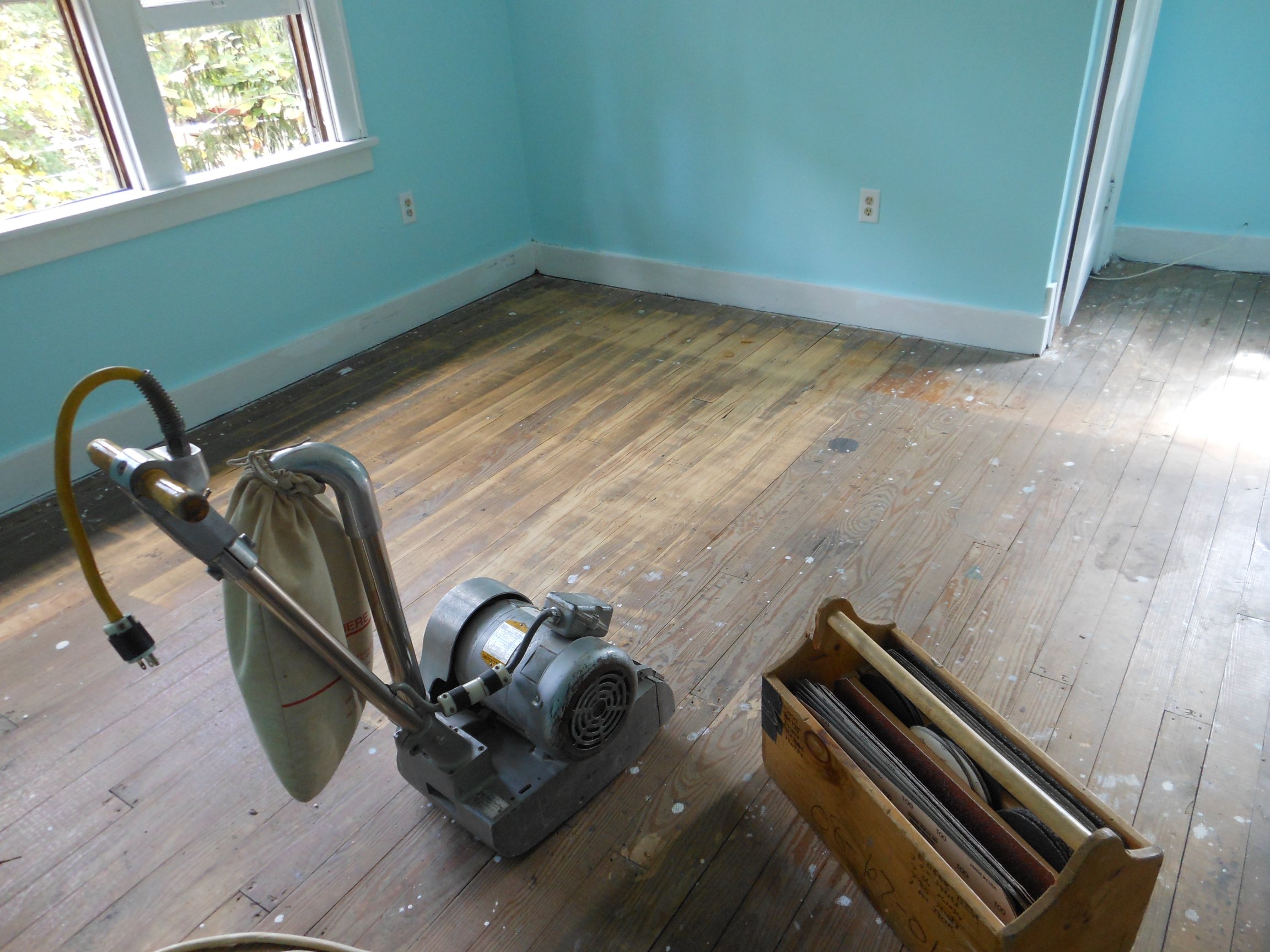 Fortunately, this floor did not take nearly as much in the way of multiple passes with the sander. And Linda was able to do the edging around the room using my home sander … so this time there was no cute little Edging Sander to try to control. I am grateful for small miracles.