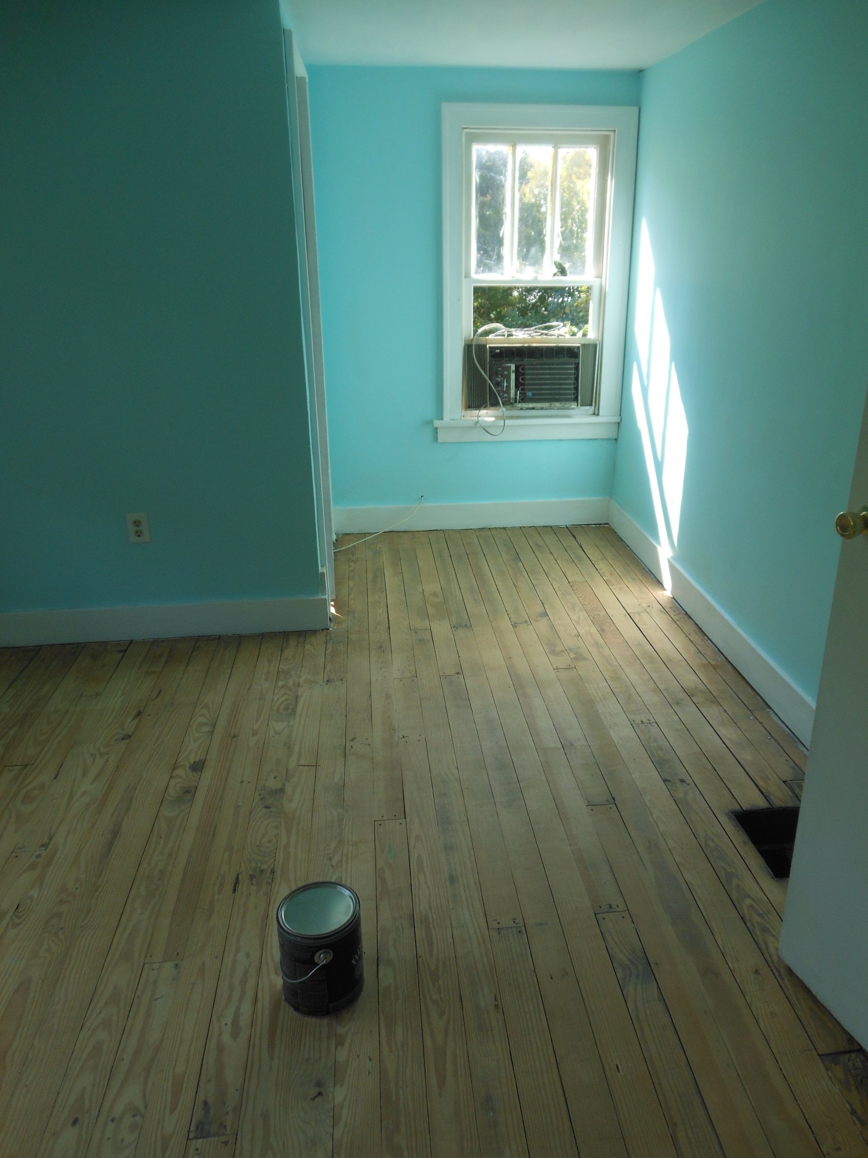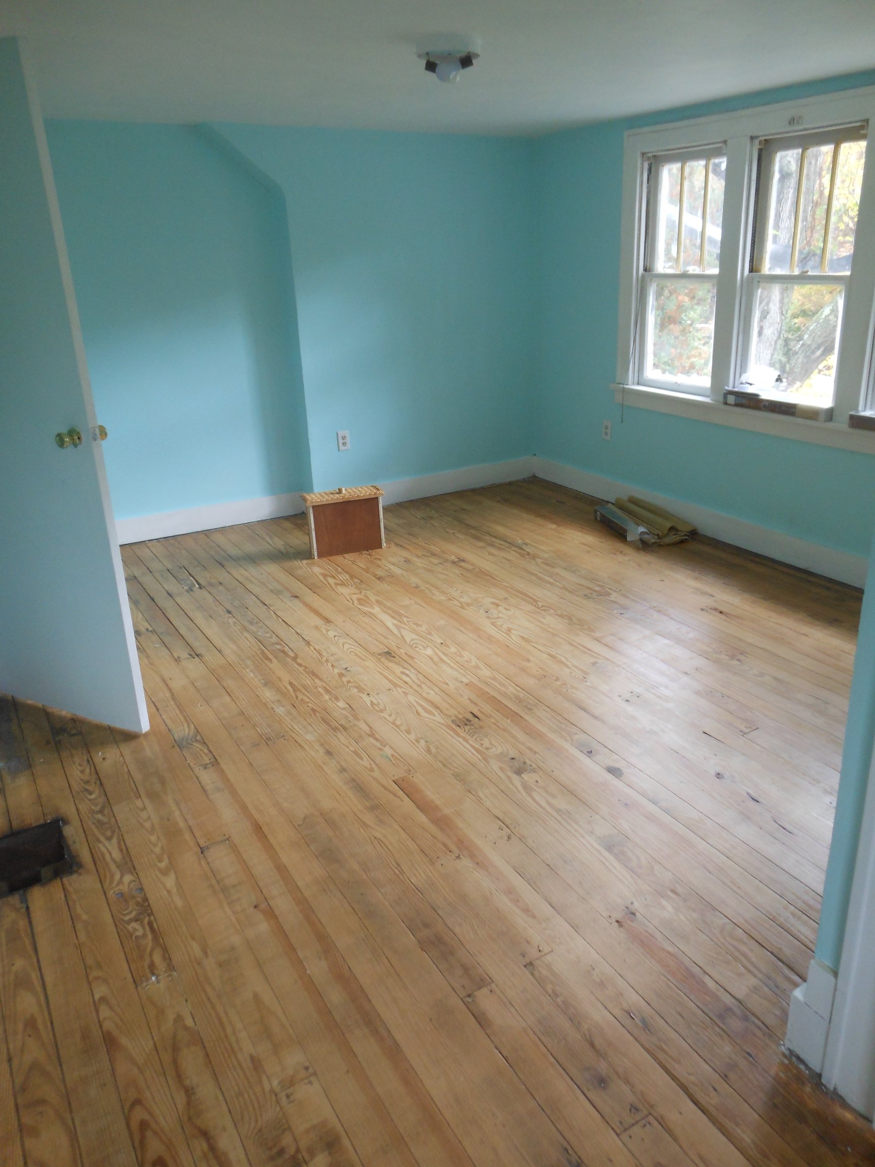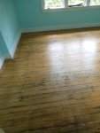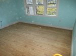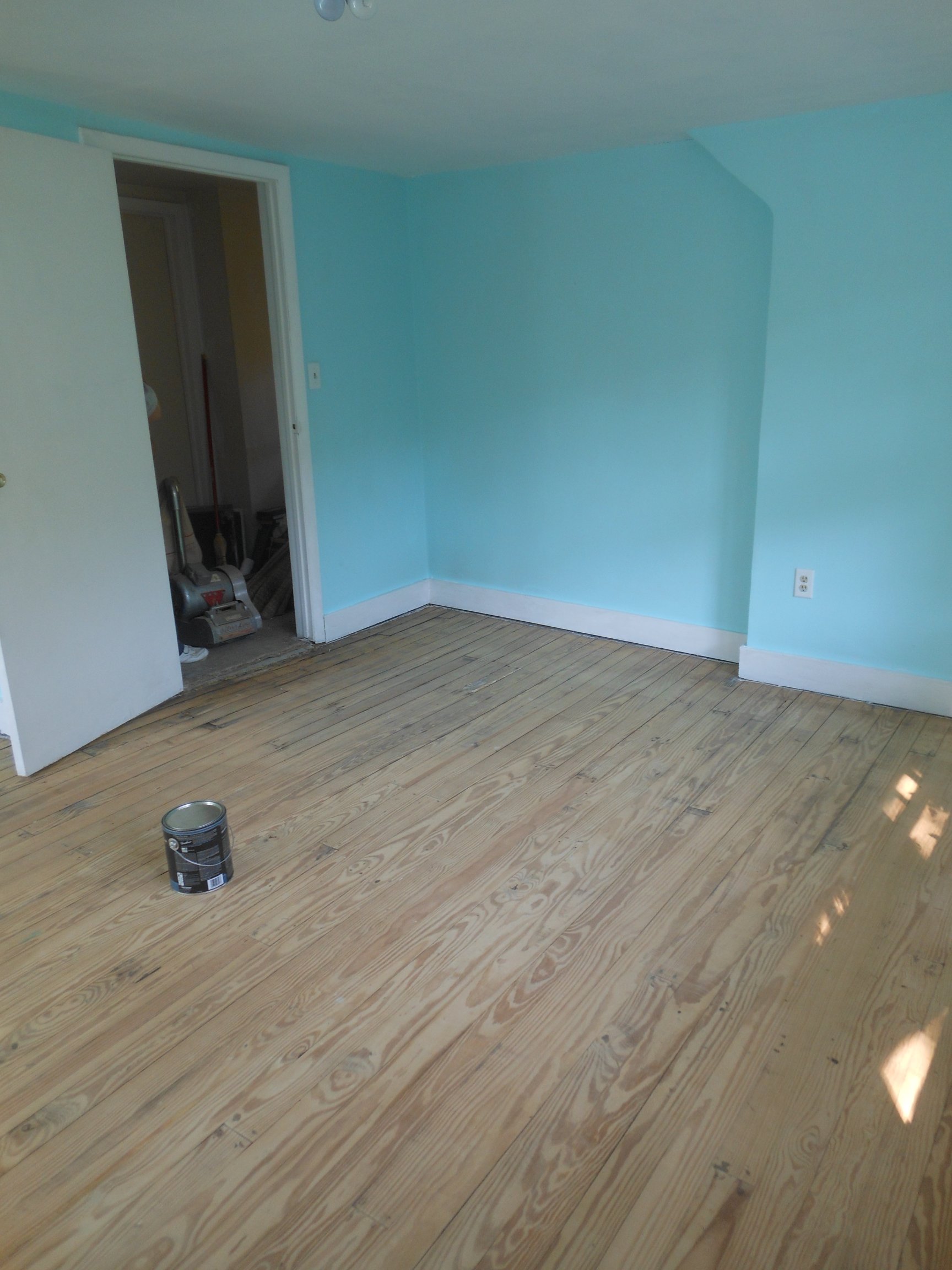 In no time flat the various sandings were done and the clear polyurethane was applied in several coats. And in evidence of all of that, here are the pictures of the floor in varying stages of progress.