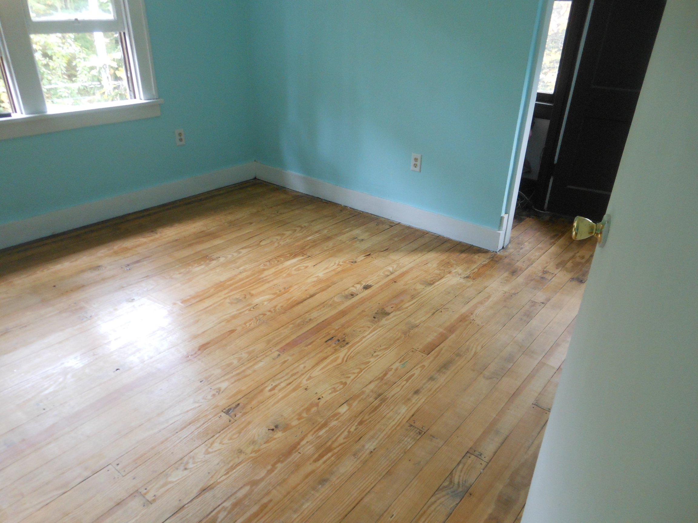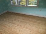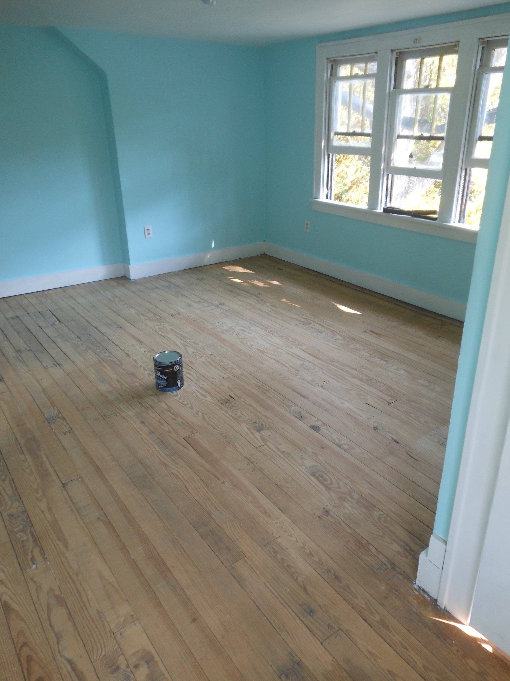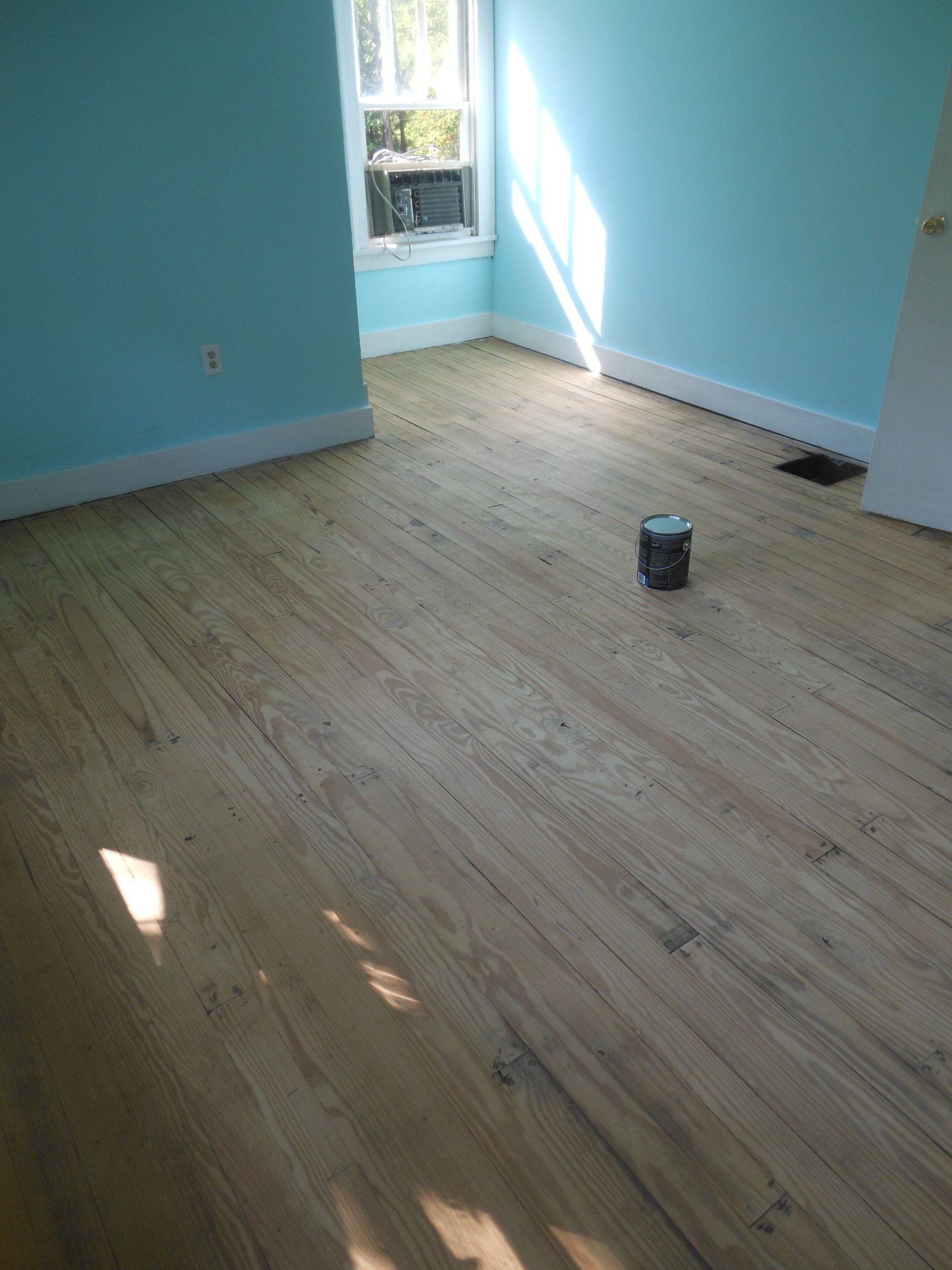 In no time flat the various sandings were done and the clear polyurethane was applied in several coats. And in evidence of all of that, here are the pictures of the floor in varying stages of progress.
