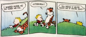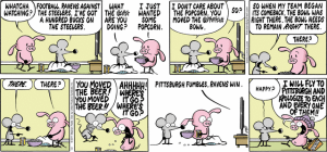 So I came back inside and started to put the two cartoons in the new wooden frames I had gotten. Nice. Light wood. Matches the floor. Pretty. Cartoons. Matches my personality. Favorite cartoonists. And both are about Pittsburgh … my home town.