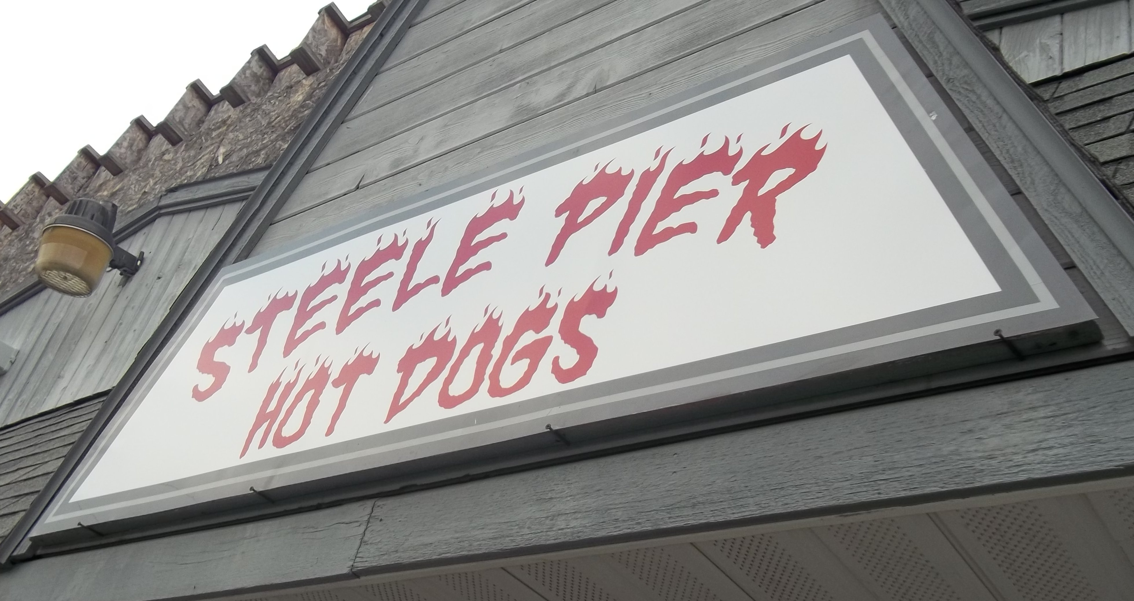 Then on the way out of the parking lot, we noticed the sign next door … I might mention it is the only thing without a picture of their sales icon … for the Steele Pier Hot Dogs.