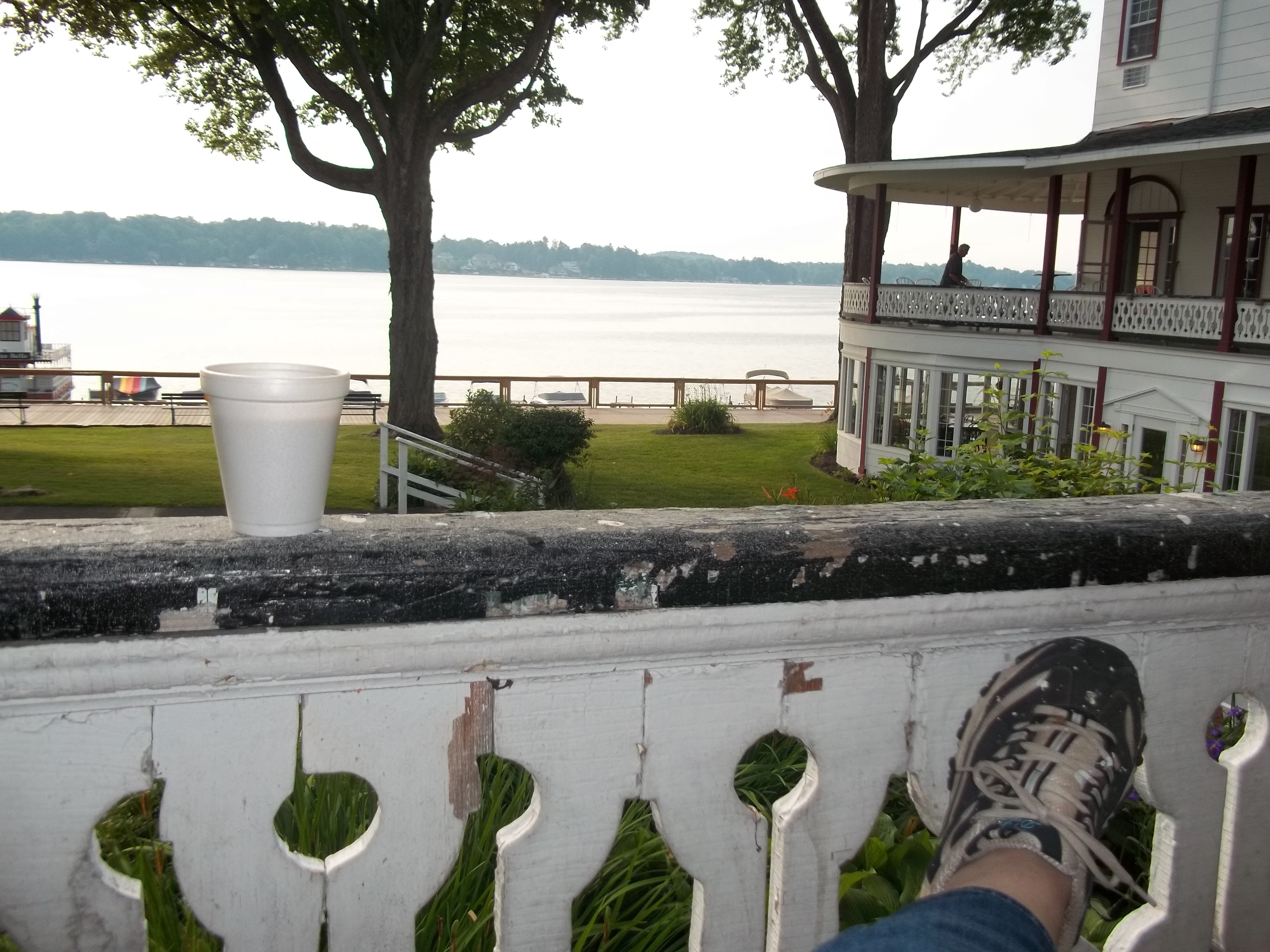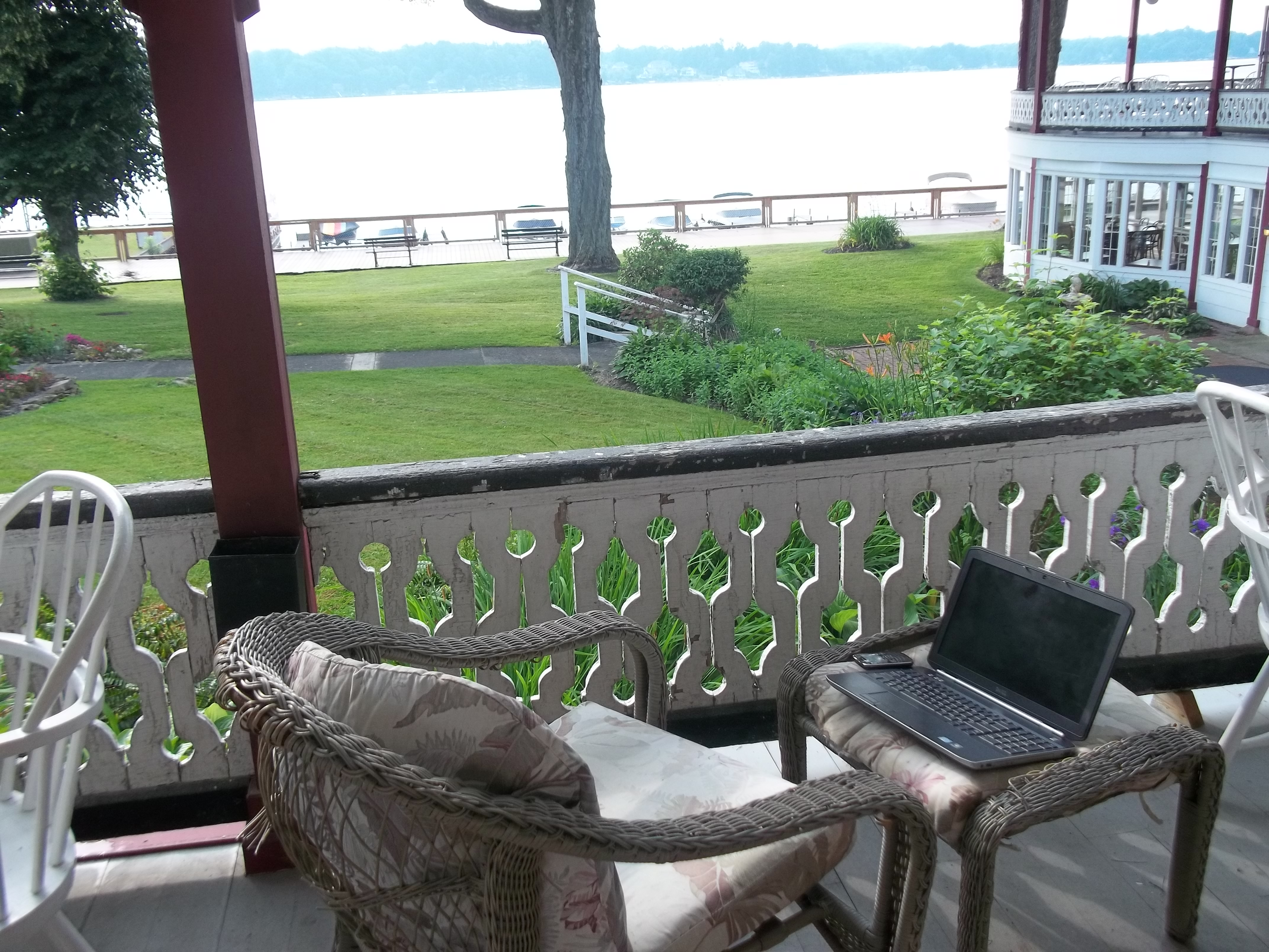 Sitting out here I said to Bill, the man who handles things here (who, after being here all night, is still up and working on the setup for a reception and a family reunion later) that this porch would be perfect if it had a comfy chair and I could prop up my feet.