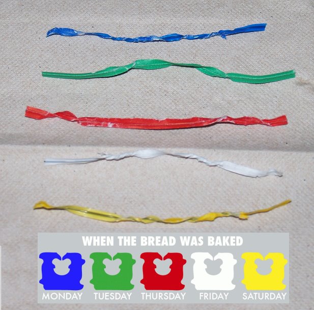 So if today was Thursday, you would want red twist tie; not white which is Fridays (almost a week old)! The colors go alphabetically by color Blue- Green – Red – White – Yellow, Monday through Saturday. Very easy to remember. I thought this was interesting. I looked in the grocery store and the bread wrappers DO have different twist ties, and even the ones with the plastic clips have different colors. You learn something new everyday! Enjoy fresh bread when you buy bread with the right color on the day you are shopping.