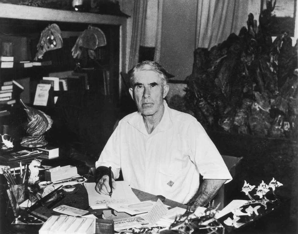 circa 1925: Portrait of American author Zane Grey (1875 – 1939) writing on a notepad while sitting at his desk.